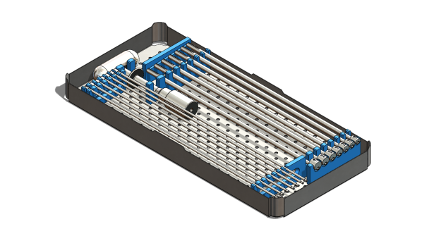 The kit is delivered in a storage case designed for sterilisation.